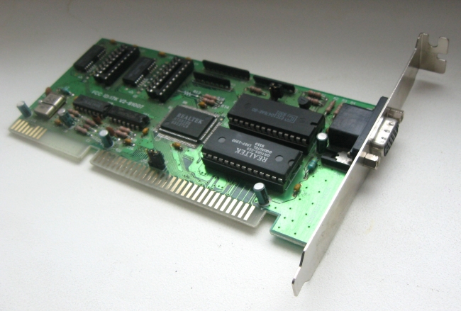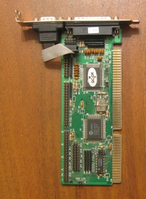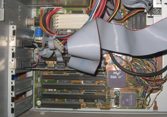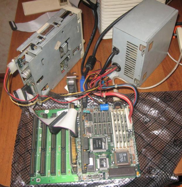 Сборка этого компьютера, как это ни странно, вызвала наибольшее количество трудностей. Прежде всего необходимо было убедится что это вообще работает. Для этого, плата с установленной на ней памятью (4шт. 30-пиновых SIM), ISA-видеокартой и подключенной клавиатурой была подключена к блоку питания и монитору. Убедившись что плата подает признаки жизни – встал вопрос подключения к ней дисковода, а значит нужно было найти ISA-мультикарту (или мультяху, как ее называли в народе) – эта такая плата, которая вставлялась в ISA-слот и уже к ней можно было подключать винчестверы, дисководы, порты LPT, COM, GAME.
