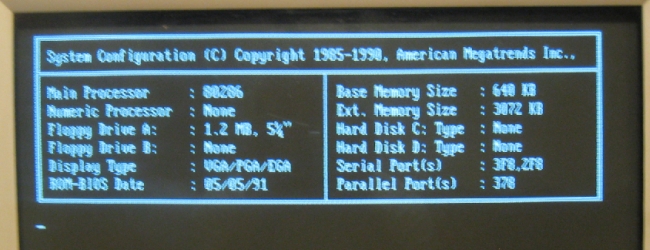 Следующий шаг – накопитель. Винчестер (винт) к сожалению найти не удалось, но нашлась парочка пятидюймовых накопителей и самое главное – дискеты для них были! Подключив все это хозяйство так как это показана на первой фотографии, сконфигурировав соответствующим образом БИОС встала другая проблема – дискеты от старости (хотя и из упаковки) уже практически ни на что не годились, да к тому же нужно было как-то сделать системную дискету. Помог собранный чуть ранее компьютер на процессоре Celeron-300, дело в том, что один из двух имеющихся дисководов я установил в корпус этого компьютера, и теперь можно было на нем работать с этими дискетами. Но отформатировав, создав и проверив на нем системную дискету – возникла еще одна неожиданная проблема, собранный на 286 процессоре компьютер не захотел с нее грузиться – крутанув пару раз дискетой он просто уходил в глубокий ступор.