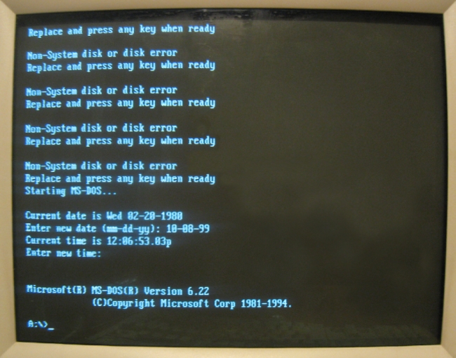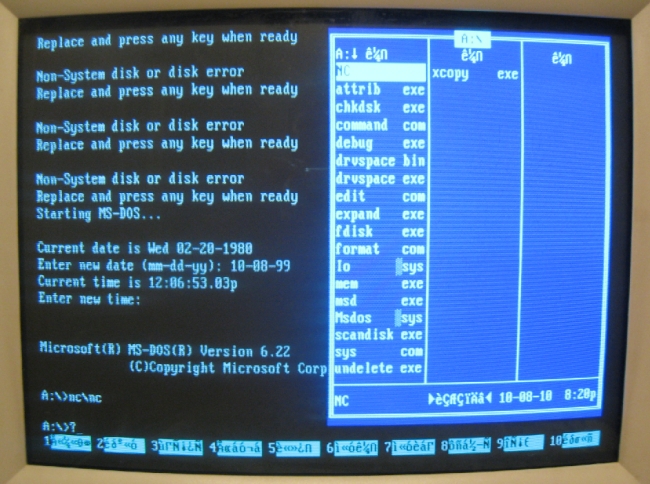 Возникла еще более сложная проблема – найти DOS ранних версий. Случайно нашелся DOS 6.22 и вновь отформатированная дискета, уже с установленным на нее DOS 6.22 полезла в дисковод. (правда пришлось оставить только самые важные файлы, ибо во-первых требовалось место для Norton Comander, а во-вторых – процентов 25-30 дискеты было напрочь разрушено). Пошуршав дискетой, неожиданно на экран вылетело: Non-System disk or disk error. Это уже что-то, по крайней мере дискету он видит :) Где-то с десятой попытки все же удалось считать полуубитую дискету, и вот оно долгожданное приветствие DOS 6.22!