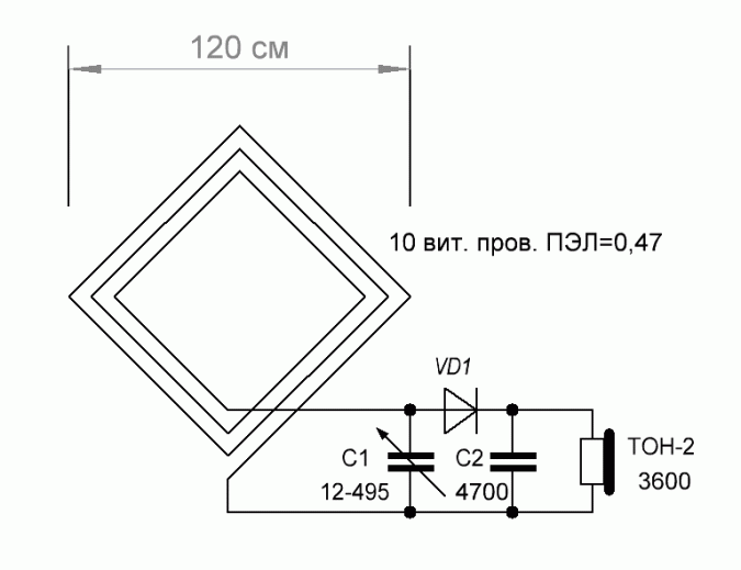 Рамка собрана из двух деревянных реек, соединенных крест на крест. На концах полученного ромба делаются небольшие пропилы, в которые и будет укладываться провод. Рсстояние между пропилами – 10 мм. Всего нужно намотать 10 витков. В данной конструкции был использован обычный обмоточный провод диаметром 0,47 мм, в эмалевой изоляции. Наушники – высокоомные.