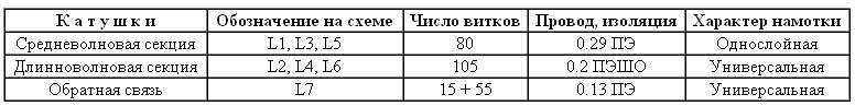 Катушки контуров высокой частоты: все три катушки приемника имеют одинаковые данные намотки, за исключением того, что на третьей катушке имеется дополнительная намотка обратной связи.
