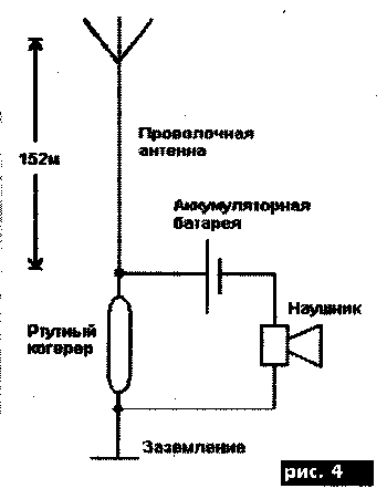 Предполагаемая схема приемника Маркони, используемая им для трансатлантической связи, представлена на рис.4. Внимательно рассмотрим ее. На схеме показаны: четвертьволновая антенна, являющаяся резонансной для принимаемого сигнала, ртутный когерер, наушники, аккумуляторная батарея. Рассчитывая использовать полуволновую резонансную антенну для длины волны 300 м, Маркони случайна использовал четвертьволновую резонансную антенну для действительной частоты работы передатчика. В самом деле, длина волны для частоты 511 кГц составляет 587 м, а четверть длины волны - 147 м, что очень близко к длине используемой Маркони антенны.