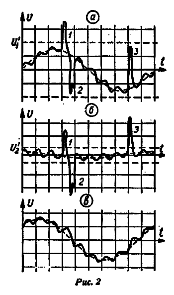 Обратимся к рис. 2, а. На нем показана осциллограмма полезного сигнала и помех. Полезный сигнал представлен здесь двумя частотами - низшей (допустим, 200 Гц) и высшей (2000 Гц). Амплитуда высшей частоты значительно меньше амплитуды низшей. Если подвергнуть такое колебание ограничению, то очевидно, что помехи 2 и 3 останутся неограниченными, так как уровень ограничения, определяемый главным образом уровнем низкочастотной составляющей, равен U11.