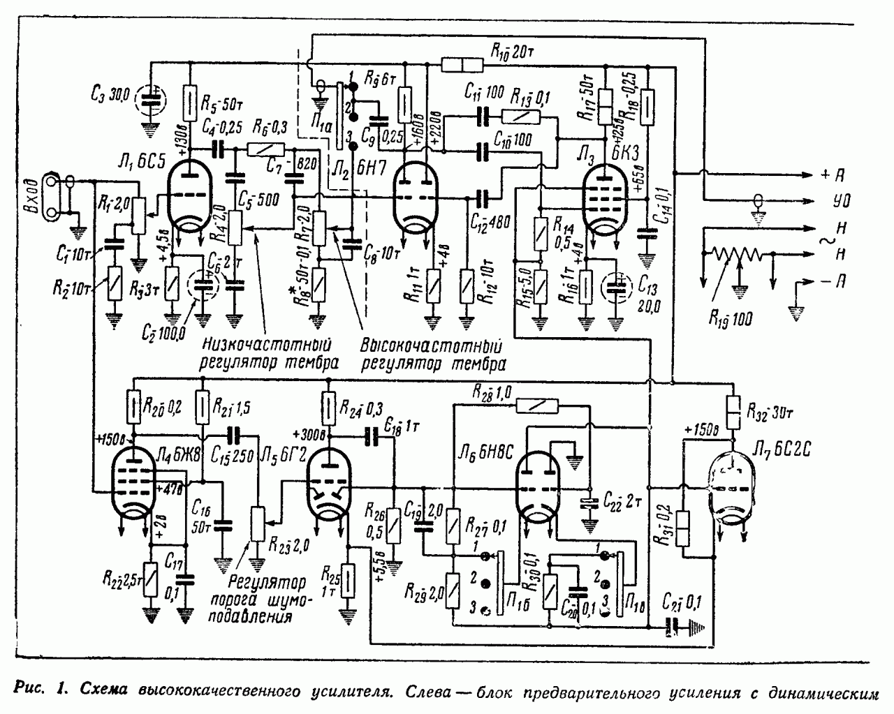 Элементы связи между электродами ламп Л2 и Л3 выбраны таким образом, что совместным действием отрицательной и положительной обратных связей при нулевом смещении на первой и третьей сетках пентода Л3 обеспечивает крутой спад частотной характеристики ступени, работающей на левом по схеме триоде лампы Л2, в области высших частот. При указанный в схеме данных деталей снижение усиления начинается с частоты 1000 Гц и достигает 30 дБ на частоте 10000 Гц. Такое снижение усиления на высших частотах вполне достаточно для полного подавления шумов.