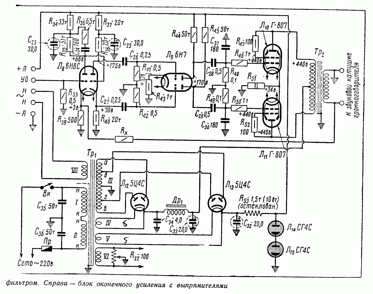 В выпрямителях, питающих блоки предварительного и оконечного усиления, работают два кенотрона (Л12 и Л13) типа 5Ц4С. Выпрямитель, питающий оконечную усилительную ступень, имеет П-образный сглаживающий фильтр. Входной конденсатор этого фильтра С34 бумажный, на рабочее напряжение 600 В.