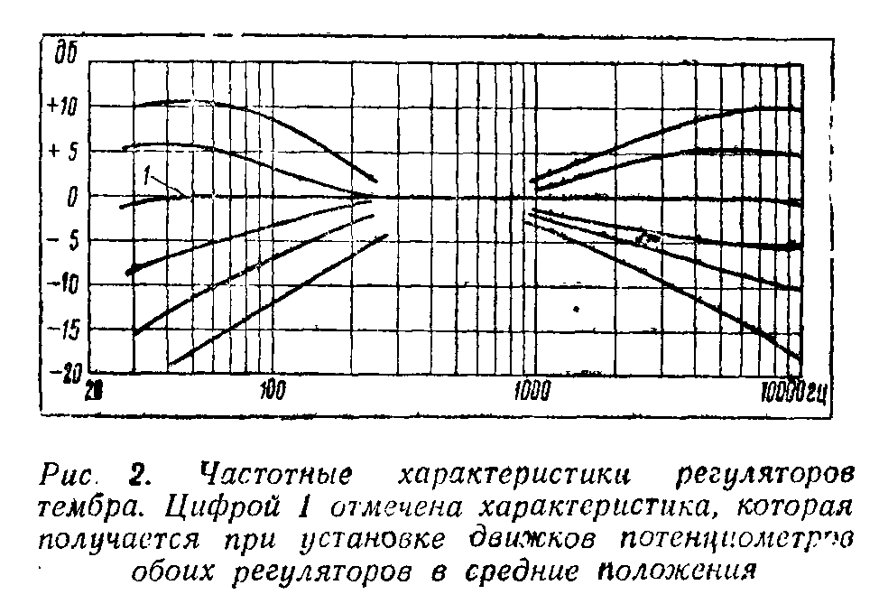 На входе ступени имеется компенсированный регулятор громкости, а на ее выходе - регуляторы тембра, позволяющие в широких пределах (до 28 - 30 дБ на крайних частотах полосы) усиливать или ослаблять как низшие, так и высшие частоты усиливаемого спектра частот (рис. 2) практически без изменения усиления на средних частотах.
