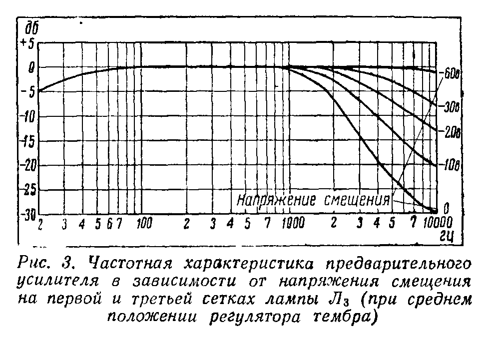 По мере увеличения этого смещения действие обратных связей ослабляется и усиление ступени, работающей на левой части лампы Л2 в области высших частот, повышается. При отрицательном смещении, равном 60 В, влияние обратных связей на форму частотной характеристики этой ступени практически прекращается, и усиление на высших частотах полосы пропускания делается практически равным усилению на средних частотах. Влияние напряжения смещения, подаваемого в цепь первой и третьей сеток лампы Л3, иллюстрируется кривыми рис. 3.