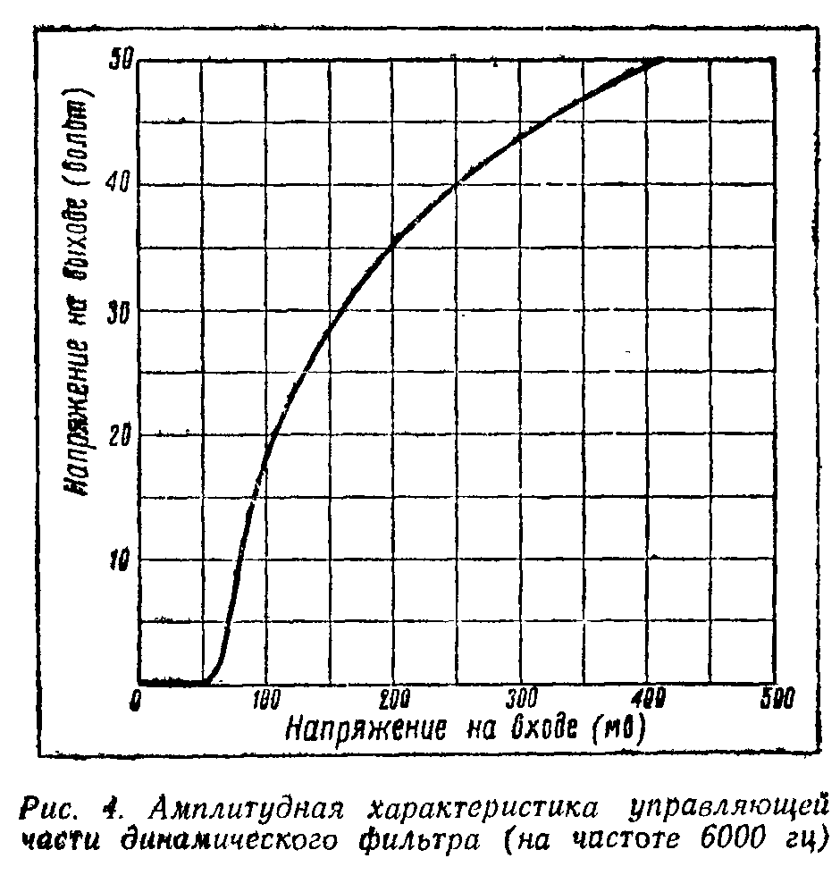 При уменьшении ее напряжения смещения до минус 2 В (для чего необходимо подать иа сетку лампу Л7 смещение около 10 В) усиление лампы Л5 достигает максимальной величины. Так как положение перегиба амплитудной характеристики канала управляющей части динамического фильтра определяется главным образом возникновением положительной обратной связи по постоянному току, эта характеристика имеет резкий подъем после определенной величины выпрямленного напряжения (рис. 4).
