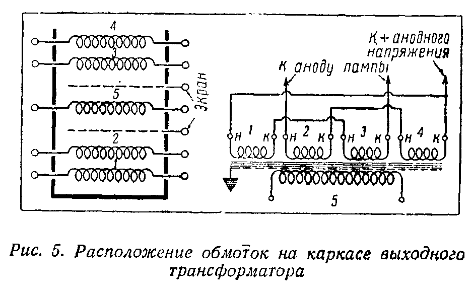 Первичная обмотка состоит иэ четырех секций по 1000 витков провода ПЭ 0,17. Вторичная обмотка имеет 78 витков ПЭ 1,0. Экран такой же конструкции, как и у силового трансформатора.