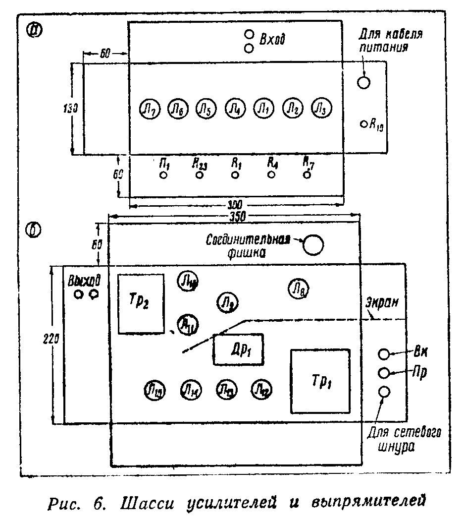 Размеры шасси блока предварительного усиления даны на рис. 6, а, а блока оконечного усиления и выпрямителя - на рис. 6, б. При монтаже рекомендуется придерживаться указанного размещения деталей на шасси.