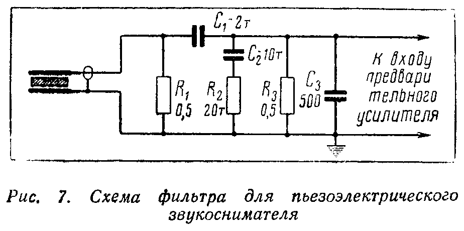 Необходимо отметить, что дспстонтсльно высококачественное воспроизведение праммзаписи и радиопередач можно получить, только применяя хороший звукосниматель и динамический говоритель с достаточным запасом по мощности. Пьезоэлектрический звукосниматель рекомендуется включать на вход усилителя через частотно-корректирующую цепь (рис. 7).