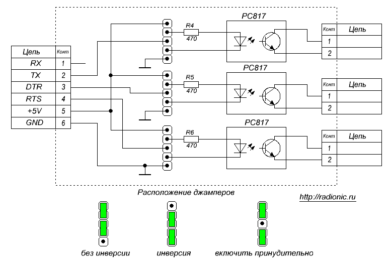 Устройство состит из трех оптопар. Причем, для работы цифровыми видами - достаточно одной, для переключения трансивера в режим передачи, обычно для этих целей программами используется сигнал DTR или RTS, для работы CW - достаточно двух (DTR, RTS). Но у меня есть планы по использованию линии TX, поэтому сделал "с запасом". Устройство может быть непосредственно подключено к трансиверу, либо можно на выходы оптопар поставить реле.
