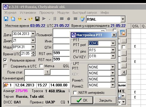 После подключения устройства к компьютеру, необходимо установить драйвера, в результате у нас в системе появится COM-порт. Далее, в програме UR5EQF , в настройках (Установки -> Настройка программы -> Настройка PTT) неоходимо выбрать появившийся COM-порт и назначить какой сигнал будет PTT, а какой CW. например, так: