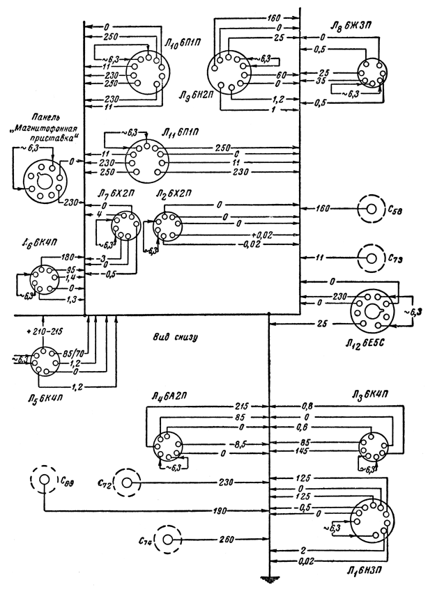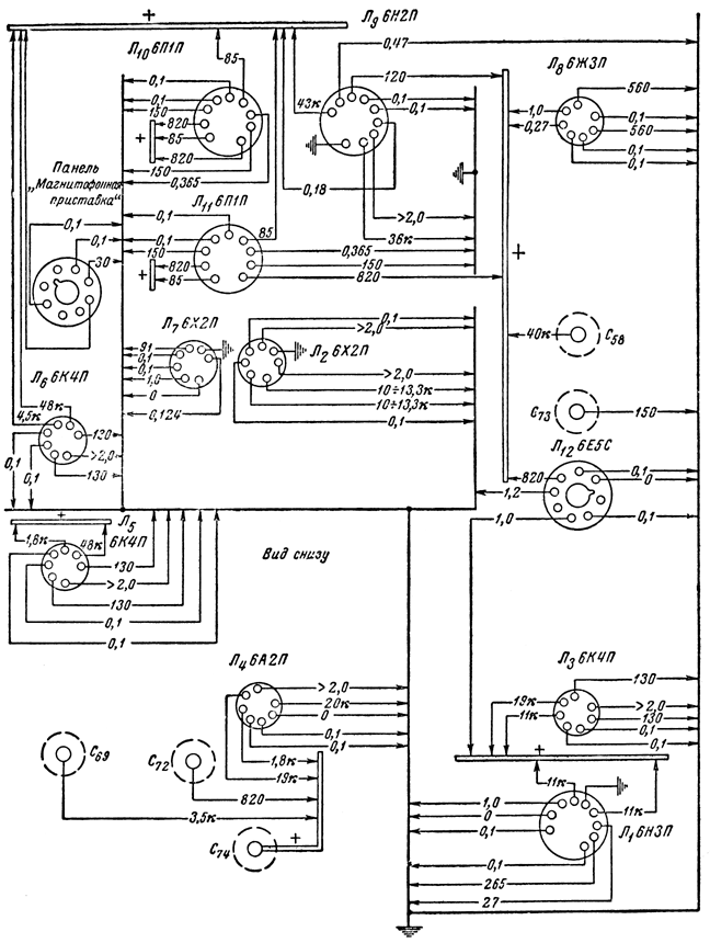 Расположение ламп и деталей на шасси радиолы "Эстония-55"