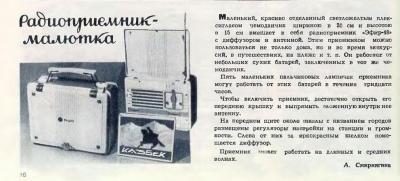 В передней крышке вмонтирована складная штыревая антенна высотой 400 мм. Приём мощных радиостанций может производиться при сложенной антенне. Рабочее положение приемника - вертикальное или горизонтальное с открытой передней крышкой. Приёмник выполнен в виде небольшого изящного чемоданчика размерами 200х150х90 мм с двумя открывающимися крышками, передней и задней.