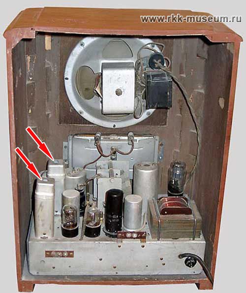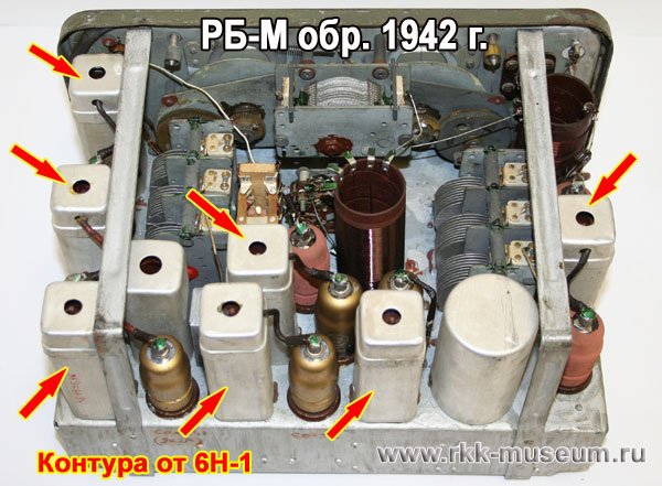 Увидеть РБ-М образца 1942 года можно в Радиомузее РКК, за что отдельное спасибо Валерию Манюку из Минска, передавшему эту радиостанцию в наш музей. Вот ее фото изнутри. Красные стрелки указывают на алюминиевые экраны фильтров ПЧ "как в 6Н-1":