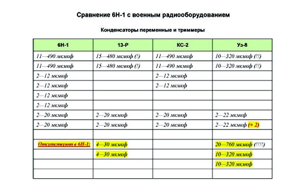 Блоки КПЕ от 6Н-1 определенно применялись в радиовещательных приемниках 4НБС-6 и 6ПБ-11. Но из военной аппаратуры образца 1942 года только в приемнике КС-2 использовался блок КПЕ от 6Н-1 (11-490 пф), а в радиостанциях 13-Р и Уз-8, судя по спецификациям, блоки КПЕ были других типов, с другими значениями минимальной и максимальной емкостей: