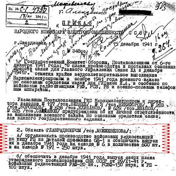 И вот какая мысль в связи со всем этим пришла мне в голову. А ведь похоже, что приказ Наркома электропромышленности СССР от 15 декабря 1941 г. № 348сс (пункт 2а) был успешно выполнен:
