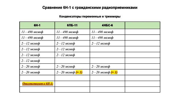 Для этого я не поленился забить в свой компьютер полные спецификации деталей и для 6Н-1, и для 13-Р, и для КС-2, и еще для четырех радиоаппаратов советского производства, где явно просматривалось использование узлов и деталей от 6Н-1. В результате появилась возможность сортировать данные и наглядно сравнивать их.
