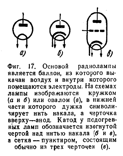 У каждой лампы обязательно есть нить накала, которая показывается дужкой внизу баллона. Следующей необходимой частью лампы является анод, который изображается короткой толстой чертой, помещаемой обычно вверху баллона. Как видно на фиг. 17, выводы электродов показываются в виде линий, идущих от электродов наружу.
