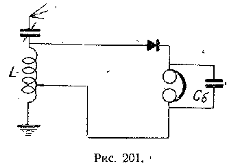 Аудион - немецкое название приемника, в котором лампа работает в качестве детектора. Ламповые приемники, в которых электронная лампа работает исключительно как детектор, являются простейшими ламповыми приемниками и по схеме (рис. 208) ничем не отличаются от схем детекторных приемников. Если в любой из схем детекторного приемника в цепь детектора вместо детектора и телефона включить лампу (сравни рис. 208 и 201) с соответствующими источниками питания и телефоном в анодной цепи, получается - аудион. (В схеме Rc и Сс - сопротивление и емкость утечки (гридлик) и R - реостат накала).