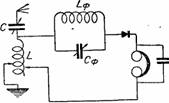 б) Фильтры преграждающие состоят из параллельно включенных емкости Сф и самоиндукций Lф, т.е. колебательного контура, включаемого последовательно в антенну (рис. 205) или детекторный контур (рис. 206). Будучи настроены на волну мешающей станции, они представляют для колебаний этой частоты очень большое сопротивление и поэтому не пропускают их через себя. Настройка фильтра, включенного по схеме колебательные контуры LфСф, индуктивно связываемые с антенным контуром (рис. 205), и влияет на настройку антенного контура, включенного же по схеме 206, на настройку антенного контура не влияет.