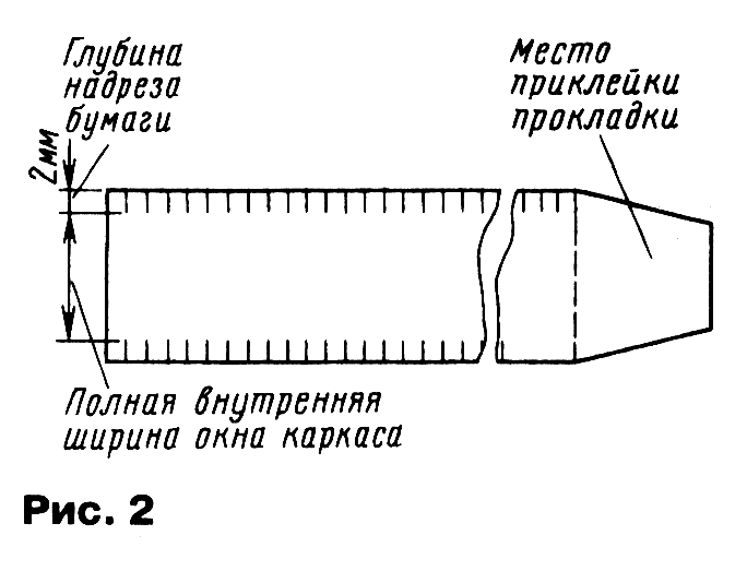 Бумажные полоски для межслойной изоляции нужно вырезать на 4 мм шире внутреннего размера окна каркаса, и по обеим сторонам ленты ножницами сделать надрезы глубиной по 2...3 мм через каждые 3...5 мм, как это показано на рис. 2. При намотке такой ленты ее края загибаются, что полностью и надежно предотвращает западание крайних витков в нижележащие слои, позволяя использовать для намотки полную ширину окна.