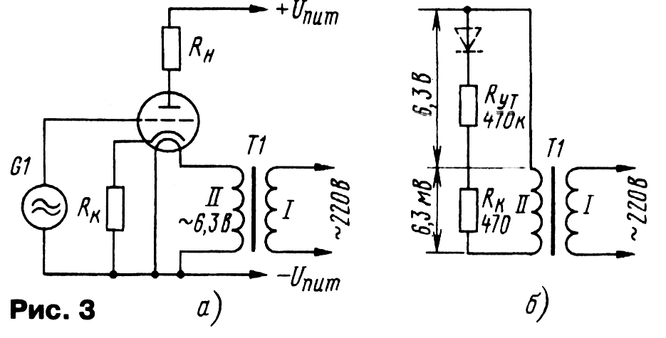 У электронной лампы между нитью накала и катодом (рис. 3,а) всегда имеется сопротивление утечки Rут Благодаря имеющемуся на катоде положительному напряжению относительно общего провода (шасси), соответствующему напряжению автоматического смещения +2 В, участок подогреватель-катод можно рассматривать как открытый диод с внутренним сопротивлением, равным Rут, величина которого колеблется от сотен до тысяч килоом. Примем это сопротивление равным 470 кОм (на рис. 3,б показана эквивалентная схема цепи накал-катод).