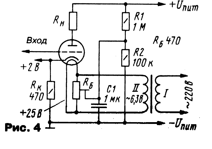 Чтобы снизить влияние второго фактора, для входного каскада выбирают лампы с минимальным паспортным значением собственных шумов. Для питания нити накала следует использовать постоянный ток от отдельного выпрямителя с пониженным до 6 В напряжением на выходе, создавать защитную разность потенциалов между катодом и нитью накала ламп предварительных каскадов. В связи с последней рекомендацией рассмотрим способ снижения фона с частотой 50 Гц, возникающего в цепи подогреватель-катод первой лампы.