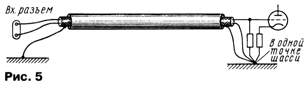 Следует учитывать, что входные и выходные сопротивления каскадов ламповых усилителей обычно на порядок больше, чем транзисторных, и измеряются сотнями килоом, поэтому собственные емкости экранированных проводов оказывают существенное влияние на частотную характеристику УЗЧ в области ВЧ. Не следует использовать современные тонкие и сверхтонкие (диаметром 3, 2 и даже 1,5 мм) "фирменные" экранированные провода. В любом случае экранированные соединения нужно делать по возможности короче.