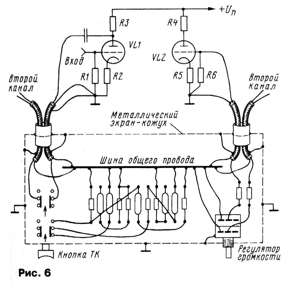 Для того чтобы уяснить принципы грамотного монтажа, рассмотрим рис. 5, где показано соединение сеточной цепи лампы с входным разъемом, отстоящим от лампы на некотором расстоянии. Рекомендации будут практически одинаковыми и для соединения любых двух узлов аудиотракта или УЗЧ, один из которых является источником сигнала, а другой - нагрузкой. Это могут быть микрофон и лампа усилителя микрофонного каскада, входное гнездо для магнитофона и коммутатор рода работ либо первые два каскада УЗЧ и блок регуляторов тембра В последнем случае источником сигнала является анод лампы первого каскада, а нагрузкой - резистор в цепи сетки лампы второго каскада и, следовательно, никакие соединения с корпусом внутри этого участка недопустимы. Иными словами, внутри закрытого металлического корпуса блока регуляторов тембра ни одна деталь не должна соединяться непосредственно с шасси или экранирующим кожухом, а только к изолированной от корпуса шине, как показано на рис. 6.
