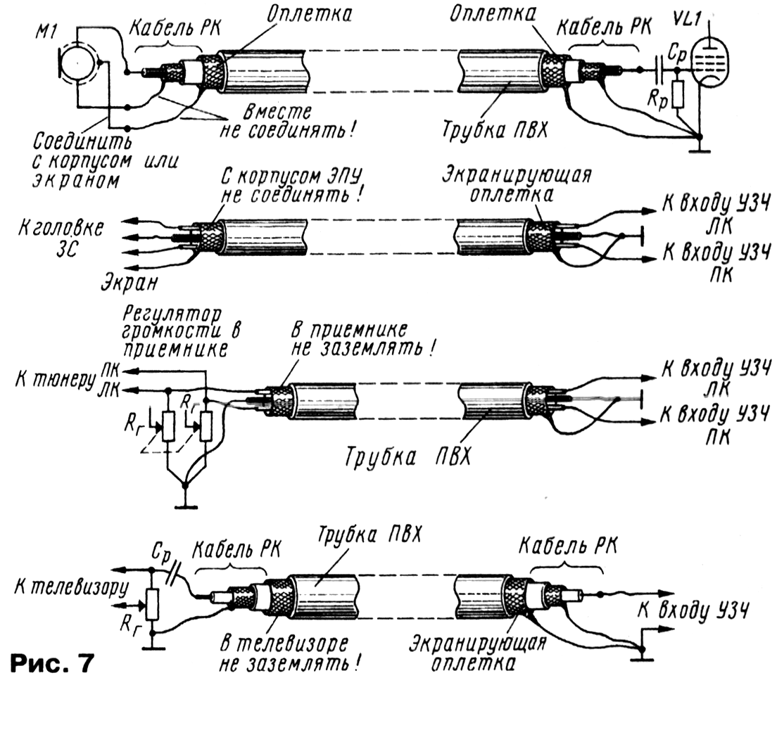 Наиболее подвержены наводкам линии от пьезоэлектрического или электромагнитного звукоснимателя, а также от микрофона. Для этих цепей можно предложить общее решение с использованием тонкого коаксиального кабеля наружным диаметром 4...5 мм и емкостью 70...115 пФ на метр, например, РК-50-2-13, РК-50-3-13, РК-50-2-21 (их старые наименования - соответственно РК-19, РК-55, РКТФ-91) либо РК-75-2-21. Для стереофонического устройства два отрезка кабеля нужной длины, помещенных в одну общую металлическую оплетку, образуют кабель с высокой помехозащищенностью. Внешнюю оплетку также желательно изолировать трубкой из ПВХ На длинный кабель трубку допустимо надевать частями длиной по 0,5... 1 м.