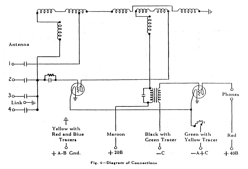 Подключение батареи: Аккумулятор «А» для нагрева нити накала: от четырех до шести 1,5 В сухих элементов, соединенных параллельно. Можно использовать аккумуляторную батарею на 2 В (один элемент, свинцовый). Батарея "B" для подачи питания на анодные цепи, состоящая из двух последовательно соединенных анодных батарей на 22,5 В или одной 45-вольтовой анодной батареи. Аккумулятор «С» для создания отрицательного потенциала сетки, состоящий из одного 1,5 В сухого элемента. рекомендуется использовать один из эеменатов «А» батареи.