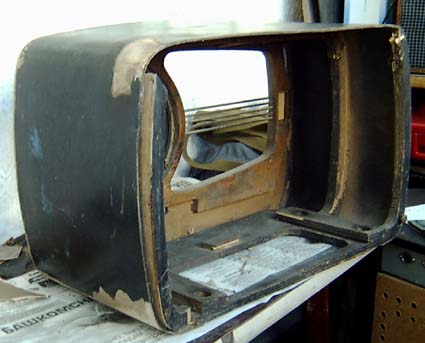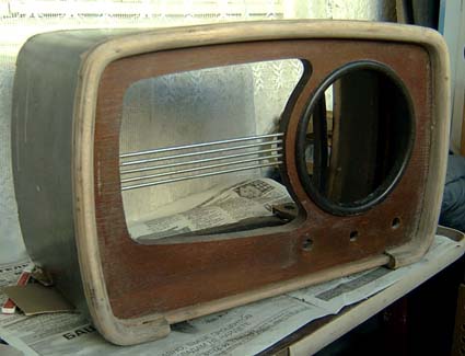 В наш век пластмассовых "дутиков", трудоемкая технология создания корпуса этого послевоенного приемника вызвала у меня чувство уважения и восхищения. Деревянный арочный каркас, придающий жесткость корпусу из гнутой фанеры, сложная многослойная конструкция передней панели. Все это скреплено столярным клеем и точеными (!?) шурупами. Чем то это напоминает конструкцию деревянных музыкальных инструментов. Конечно использование фанеры было продиктовано удешевлением и технологичностью конструкции в условиях массового ( по тем временам) производства. Время более безжалостно к фанере, чем к любому другому деревянному материалу. Фанера выхолащивается, рассыхается и начинает со временем расслаиваться. Экземпляр который попал ко мне в полной мере страдал от таких проблем. Вынув из корпуса шасси я начал работу по спасению этого своеобразного фанерного зодчества.