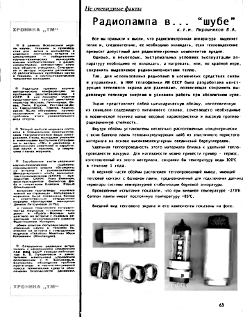 Так, для использования радиопамп в космических средствах связи и управления, в НИИ теплофизики АН СССР была разработана конструкция теплового экрана для радиоламп, позволяющая сохранить выделяемую тепловую энергию в условиях работы при абсолютном нуле.