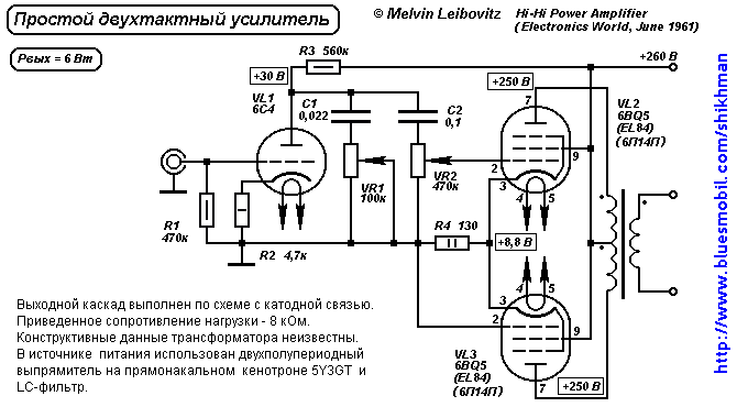 Интересно включение регулятора громкости на входе оконечного каскада и всего один переходной конденсатор. Степень катодной связи невелика, так что характер звучания, скорее всего, будет как у однотактника (с четными гармониками). Общей ООС нет, поскольку запас усиления невелик.