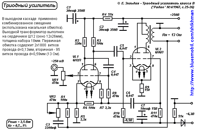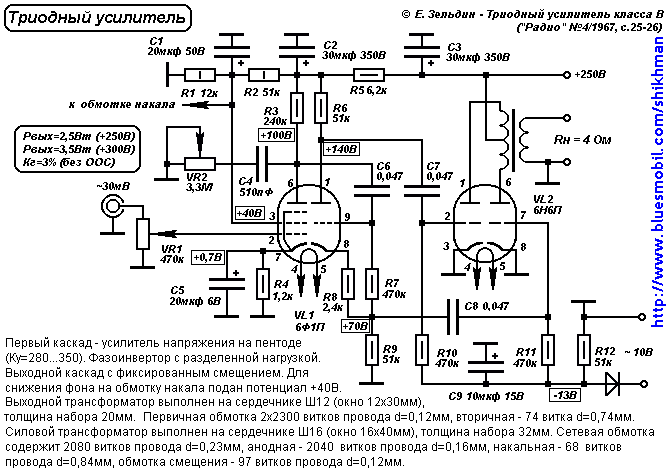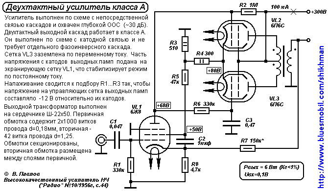 Триодный выходной каскад обладает низкими искажениями и малым выходным сопротивлением даже без общей ООС. Характеристики каскада слабо зависят от приведенного сопротивления нагрузки. Это позволяет снизить индуктивность выходного трансформатора. Далее приведены два варианта схемы усилителя с выходным каскадом на двойном триоде.