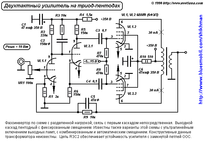 Для повышения выходной мощности усилителей кроме "запараллеливания" ламп еще в 30-е годы применяли двухтактные каскады (push-pull). Для возбуждения двухтактного каскада необходимы два противофазных напряжения, которые проще всего получить при помощи трансформатора. Так до сих пор и поступают в самых бескомпромиссных конструкциях, но степень влияния междулампового трансформатора на качество сигнала едва ли не больше, чем выходного. Поэтому в подавляющем большинстве двухтактных усилителей для получения противофазных напряжений используется специальный фазоинверсный каскад.
