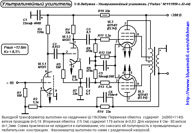 Кстати, об ультралинейном включении выходных пентодов. В двухтактном варианте у них появляется еще один плюс - дополнительная компенсация гармоник, возникающих в выходном каскаде. Поэтому подавляющее большинство любительских конструкций выполнены именно по ультралинейному варианту. В промышленных конструкциях отечественного изготовления ультралинейные усилители опять-таки не прижились из-за сложности выходного трансформатора. Для получения высоких характеристик необходима полная симметричность конструкции, секционирование обмоток, сложная коммутация. При использовании трансформаторов массового изготовления выигрыш от применения ультралинейной схемы незаметен.