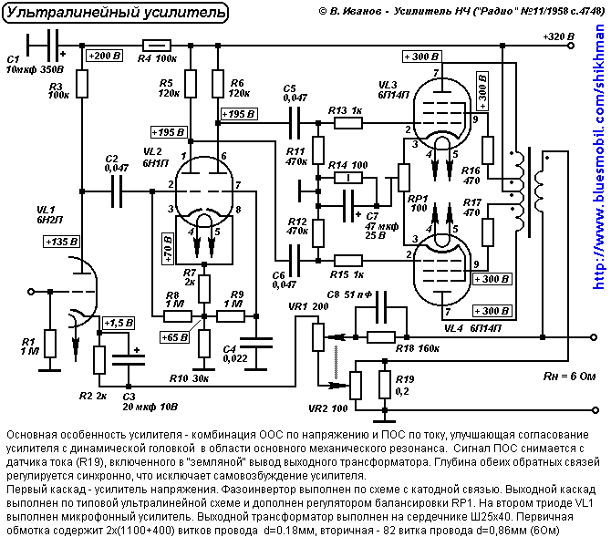 Несмотря на высокие характеристики и обычные пентодные, и ультралинейные усилители редко использовались без общей ООС. Применение ООС снижает выходное сопротивление усилителя и улучшает условия работы низкочастотных головок. Но для снижения выходного сопротивления усилителя можно использовать не только отрицательную, но и положительную ОС. В схеме следующего усилителя использована комбинированная обратная связь.