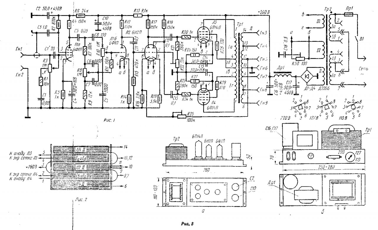 Усилитель (рис 1) имеет чувствительность 200 мВ и обеспечивает усиление электрических сигналов в полосе частот 20 - 25 000 Гц. Выходная мощность при коэффициенте искажений 1,5% около 10 Вт. Усилитель может быть использован для проигрывания грампластинок, усиления сигналов, поступающих от адаптеризованных инструментов, магнитофона и других устройств, а также как низкочастотная часть лампового радиоприемника. Питается усилитель от сети переменного тока напряжением 110, 127 или 220 В.
