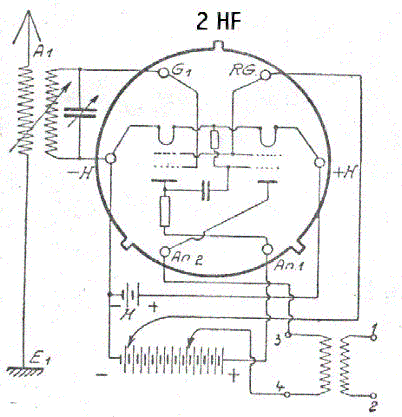 - 2HF – 2 двухсеточных лампы (лампа с сеткой в пространственном заряде – триод с катодной сеткой), 2 резистора, 1 конденсатор.
