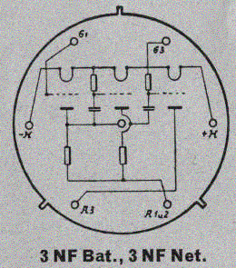 - 3NF Bat. – 3 триода, 4 резистора, 2 конденсатора. Накал 4 В, 0,125 А