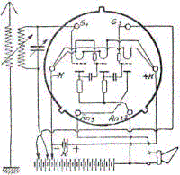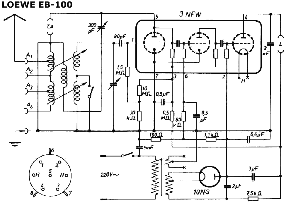 Более сложный двухдиапазонный регенеративный радиоприемник "EB100" на следующей модификации ВИС (вакуумной интегральной схемы) 3NFW, был выпущен в продажу в 1930 году. Его схема имеет вид: