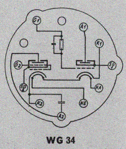 - WG34 – 1 тетрод, 1 мощный пентод, 1 резистор, 2 конденсатора. Накал 50 В, 0,18 А