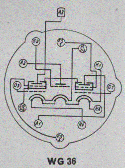 - WG36 – 2 пентода, 1 триод. Накал 65 В, 0,18 А. Радиочастотная лампа.