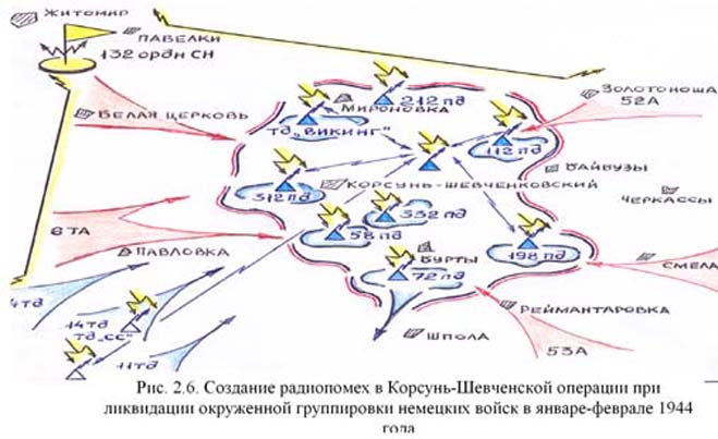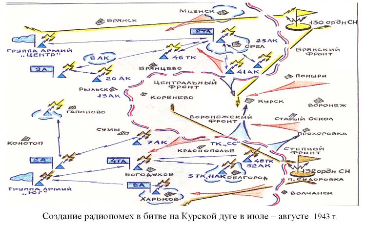 В Курской битве впервые начали создаваться помехи радиосвязи противника силами двух взаимодействующих частей радиопомех - 130-м и 132-м радиодивизионами специального назначения. Главное внимание при создании радиопомех уделялось нарушению радиосвязи штабов дивизий и корпусов противника, наступавших на северном и южном крыльях Курского выступа, а также офицеров связи авиации при сухопутных войсках.