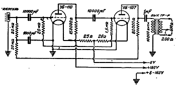 Питается усилитель от аккумуляторов или сухих батареи напряжением в 6 V и 160 V. Смещение на сетки ламп задается автоматически за счет тока накала.