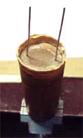 6. Зажимаем смонтированные конденсаторы в тиски и надеваем на них стакан. Тщательно отцентрировав конденсаторы таким образом, чтобы расположение выводов соответствовало оригиналу, аккуратно заливаем стакан расплавленным воском. Заливку надо довести до такого уровня, чтобы поверх воска можно было разместить вторую крышку и сделать вальцовку по старому шву.