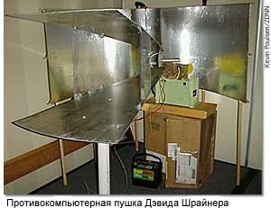 Радио-пушка использует технологию, восходящую ко временам Тесла, по существу создавая в антенне 20-мегаваттный всплеск беспорядочного радиошума. Этой энергии достаточно, чтобы вызвать в чувствительных компонентах близлежащих компьютеров помехи, приводящие к непредсказуемым эффектам, начиная от мелких отклонений в работе и кончая полным выходом из строя. Сейчас Шрайнер строит более мощную пушку, способную сокрушать компьютеры и глушить двигатели автомобилей в радиусе 30 м. Расходы на ее изготовление составят всего 300 $.
